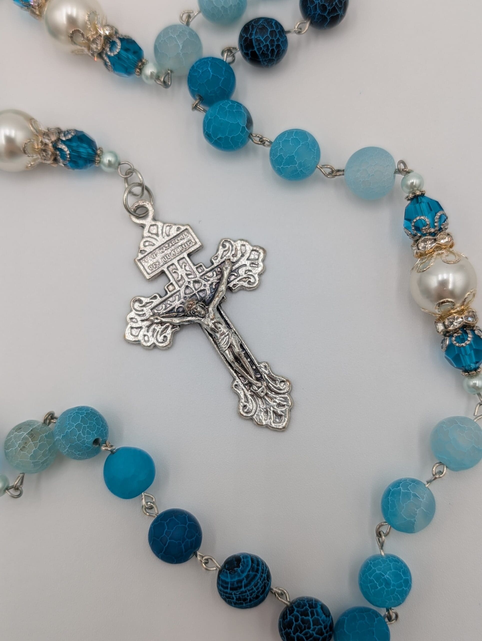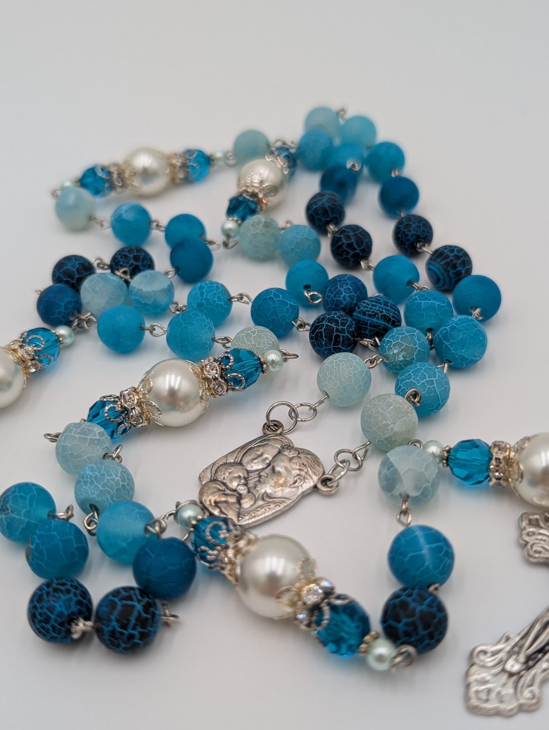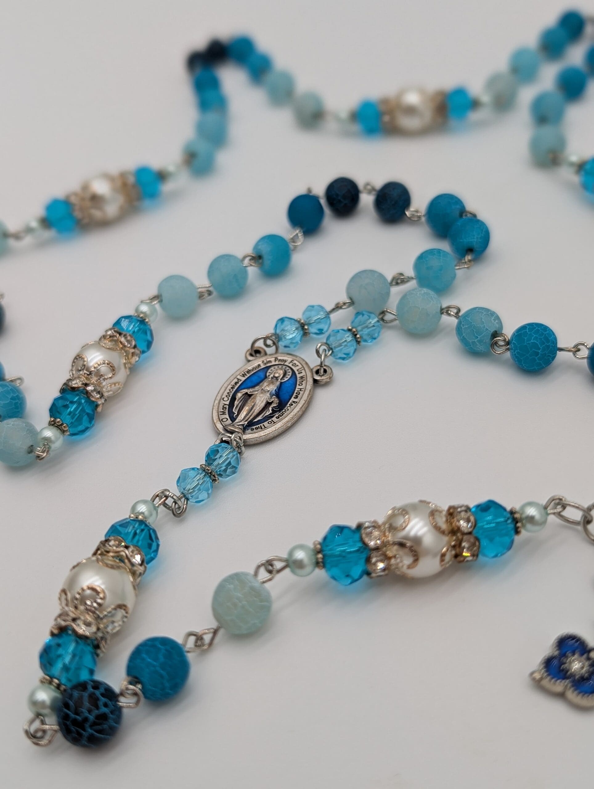 This is the cousin of Beachy Breeze and Ocean Treasure, and is a hybrid of both, appearing on paracord. It features Marie's careful sequencing of 8mm frosted blue agate Hail Mary beads that lead to an ornate Our Father. Like Ocean Treasure, this features the Italian centerpiece of the Holy Family inscripted with "Pray for us" on the back.