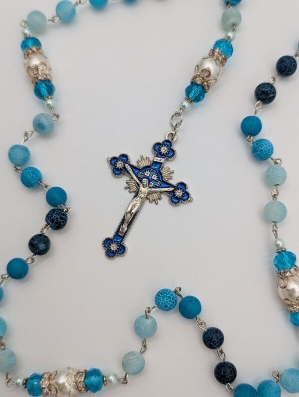 Dive into prayer with this Carribean blue frosted agate rosary on silver links. Each decade of the rosary has you ride gentle waves that begin as a coastal light blue to the hue of the ocean deep back to the foamy surface to arrive at a large pearl Our Father flanked by dazzling aquamarine Czech crystals reflecting sunlight on water. A miraculous medal of Mary backlit in blue compliments a silver and blue crucifix.