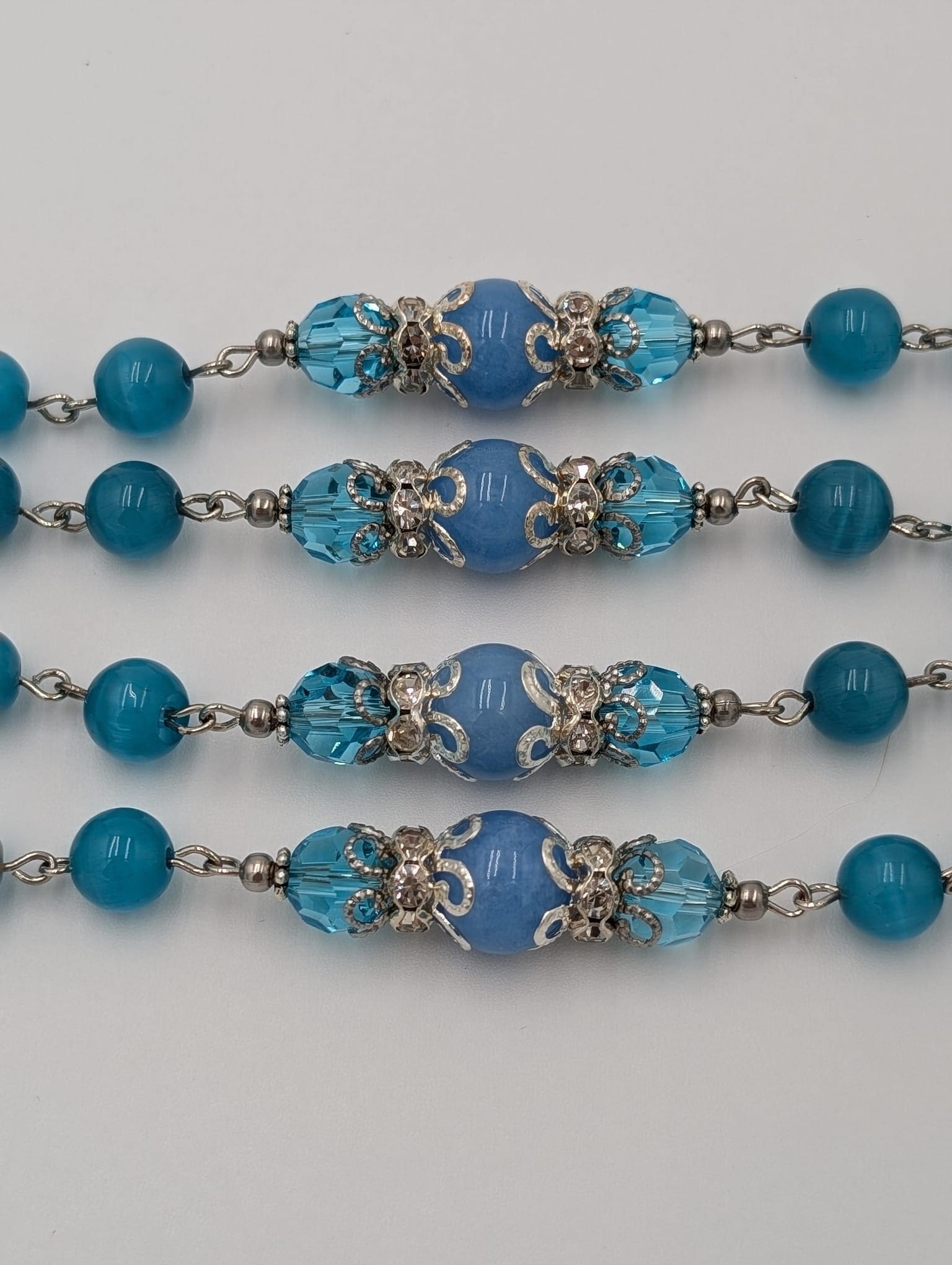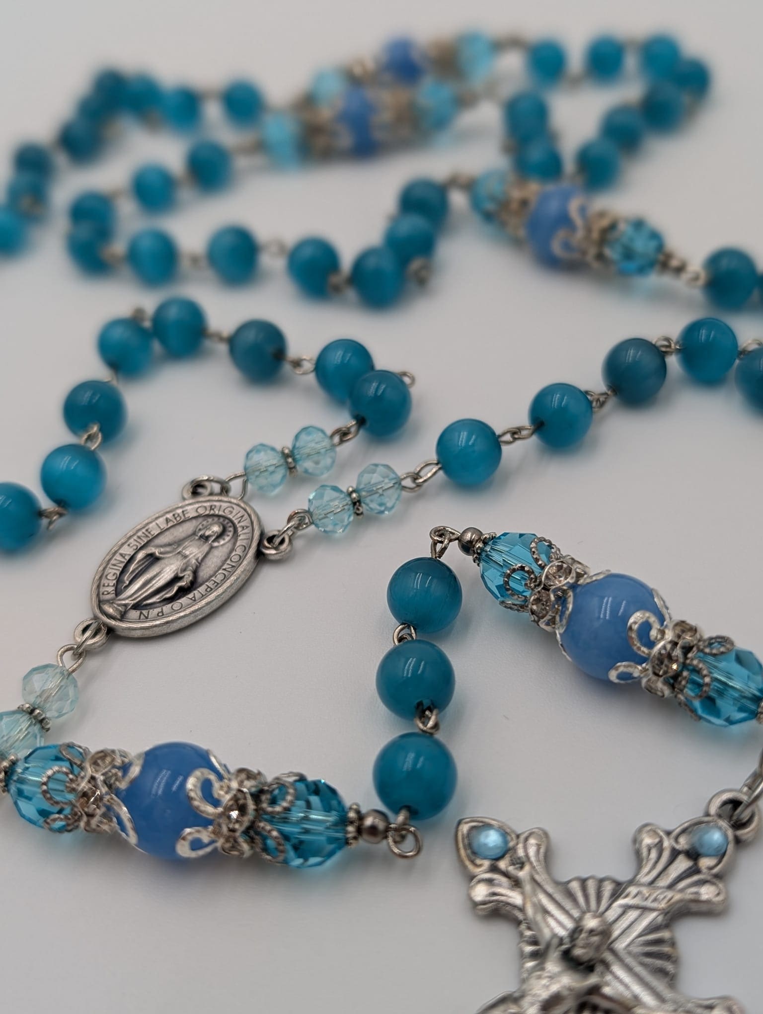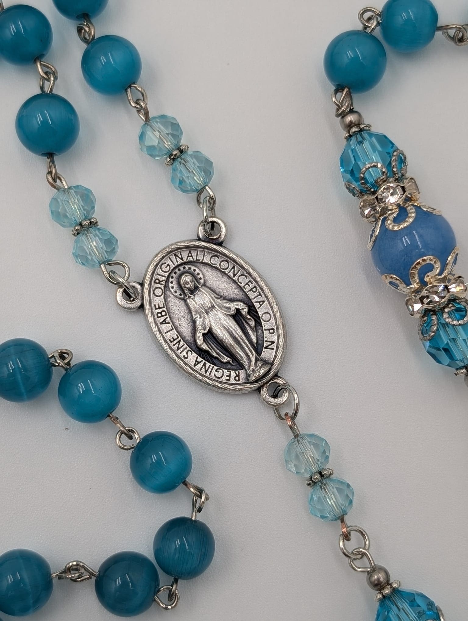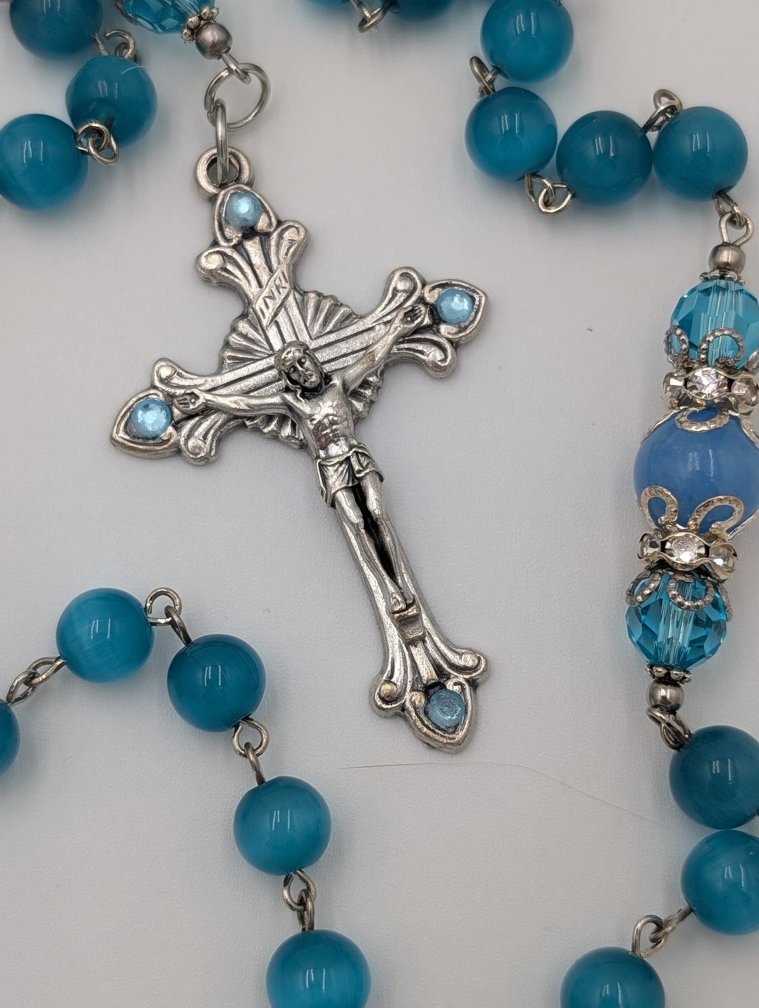 We are absolutely enchanted by cat eye beads. A cat eye stone refers to a gemstone called chrysoberyl, that exhibits a unique optical phenomenon where a bright, narrow band of light reflects and moves across the surface of the stone resembling a cat's eye. This bright blue rosary lifts our hearts and is sure to lift yours as well. The ornate Our Fathers are comprised of pale blue jade with vibrant aqua Austrian crystals and silver filligree.