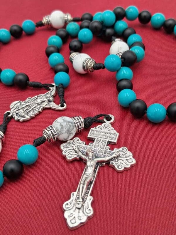 Made of all natural semi-precious stones, Daemonum Interfector uses 8mm turquoise and black agate to create the initial color palette. The Our Father beads are made of 10mm white veined marble, with St. Michael the Archangel and Pardon crucifix to round out this rosary to help fight and slay the demons in your life.