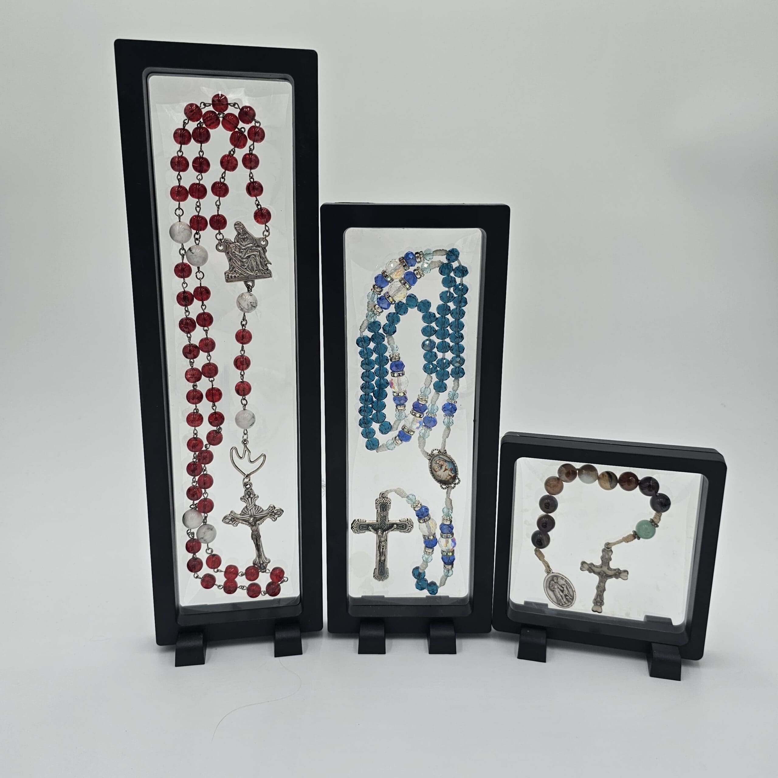 Floating display case suspends your rosary allowing you to view it from the front and the back. Comes with two feet and available in three sizes: long, medium, and small. Rosary not included.