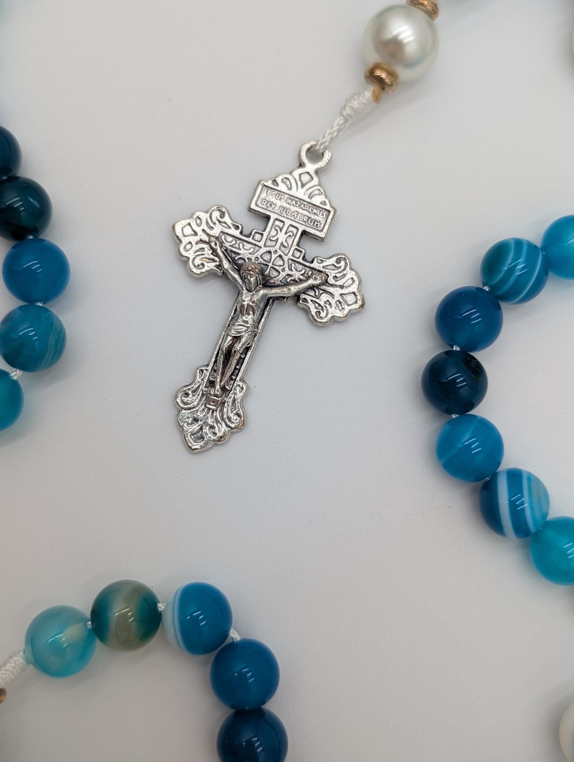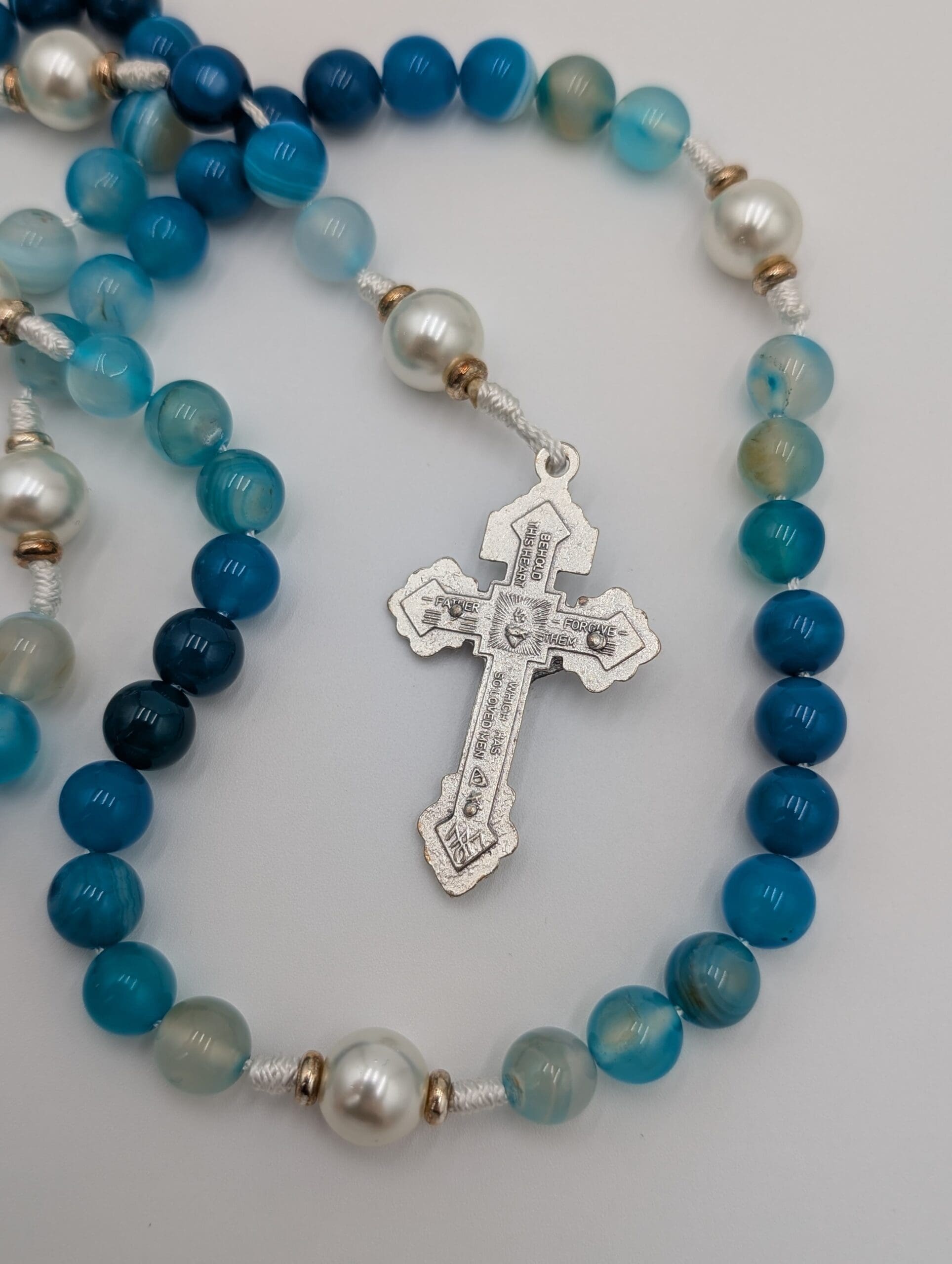Similar to Beachy Breeze, but on paracord, this rosary will have you diving into prayer with this large 10mm Carribean polished agate rosary. Each decade of the rosary has you ride gentle waves that begin as a coastal light blue to the hue of the ocean deep back to the foamy surface to arrive at a singular large Our Father pearl. The centerpiece features the Holy Family on the front and on the back the inscription "Pray for us" beseeching their help, and a special Pardon crucifix which is more than an artifact, but a profound symbol of the Christian call to forgiveness and repentance. We love the large beads which feel heavy in the hand, and are easy to navigate the rosary for those with hands weakened from arthritis.